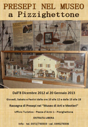 In contemporanea: visite guidate alla scoperta delle mura (sabato e festivi, dalle 15); ‘Il magico mondo di Babbo Natale’ (14-24 Dicembre 2012, mura via Boneschi, info: www.natalepizzighettone.it); XXVIII Incontro Gruppo Pittori Pizzighettonesi (23 Dicembre 2012-6 Gennaio 2013, Centro culturale via Garibaldi, domenica e festivi ore 10-12 e 15-19)
