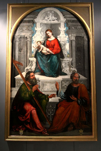 Il 12 dicembre 1985, su disposizione dell’allora Soprintendente per i Beni Artistici e Storici delle province di Brescia, Cremona e Mantova, Antonio Paolucci, in seguito Ministro per i Beni Culturali e oggi Direttore Generale dei Musei Vaticani, l’opera Madonna con Bambino in trono e santi Andrea e Pietro, conservata nella Pinacoteca del Museo Civico, venne trasferita all’Opificio delle Pietre Dure di Firenze. La decisione del trasferimento venne presa in quanto l’opera, di notevole pregio storico-artistico, presentava gravi ed articolati problemi di conservazione.