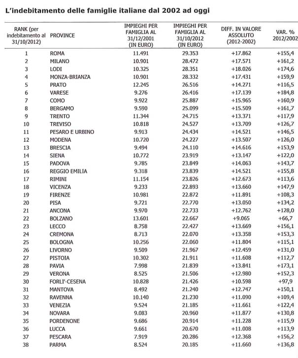 Al 31 ottobre 2012, Cremona è 24esima (su 110 province) con un debito bancario medio di 22.070 euro, quando al 31 dicembre 2001 era di 8.713 euro, 13mila 358 euro in meno. La variazione in dieci anni è stata del 153,3%. In graduatoria, le famiglie più in “rosso” sono risultate essere quelle residenti nella provincia di Roma, con un debito bancario medio pari a 29.353 euro (+155,4% rispetto a 10 anni prima). Al secondo postoci sono i nuclei familiari ubicati in provincia di Milano, con 28.472 euro (+161,2% rispetto al 2002). Nell’ultimo gradino del podio si piazzano le famiglie di Lodi, con 28.351 euro (+174,6%). In coda alla classifica, invece, le famiglie della provincia di Vibo Valentia, con 9.154 euro di debito, dell’Ogliastra, con 8.623 euro di esposizione e di Enna, con un “rosso”, si fa per dire, di 8.586 euro.