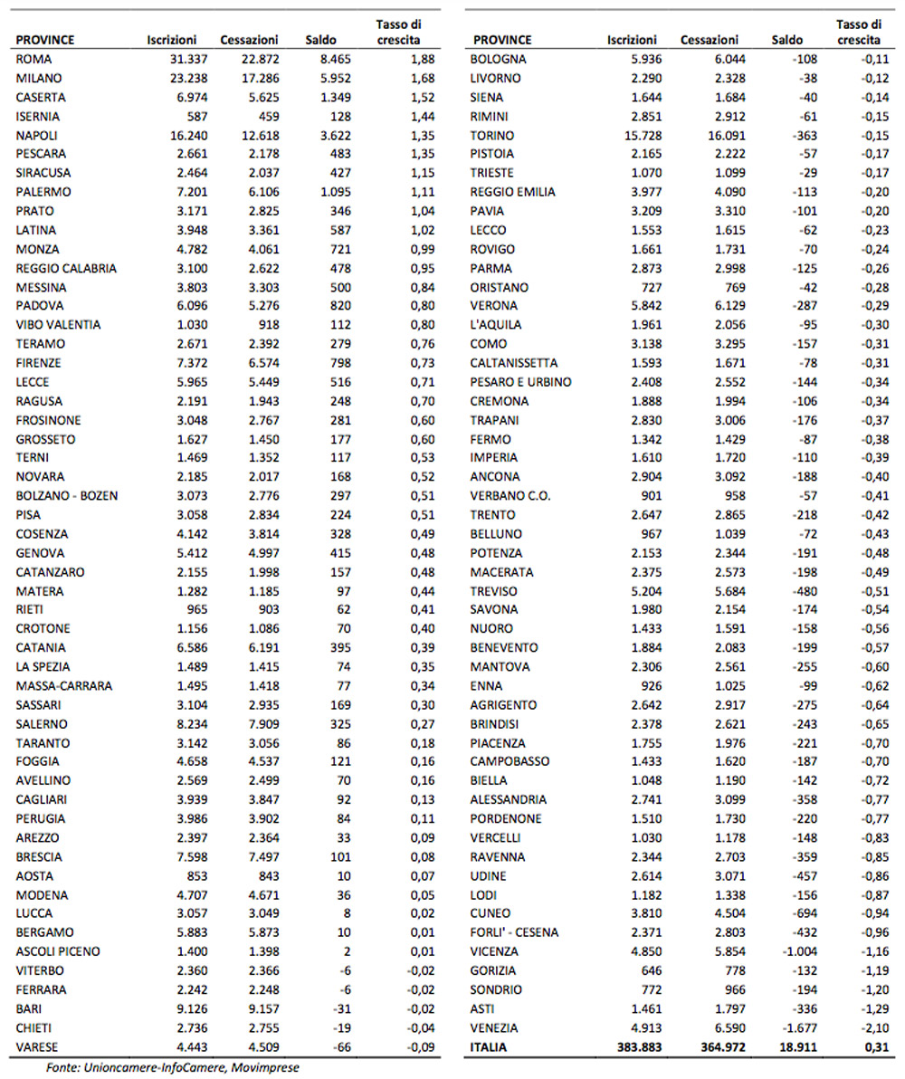 Nel Paese, sempre secondo questo dossier, sono 383.883 le imprese nate nel corso degli scorsi 12 mesi (il valore più basso degli ultimi otto anni e 7.427 in meno rispetto al 2011), a fronte delle quali 364.972 – mille ogni giorno – sono quelle che hanno chiuso i battenti (+24mila unità rispetto all’anno precedente). Come conseguenza, il saldo tra entrate e uscite si è attestato sul valore di 18.911 imprese, vicino – dopo due anni consecutivi di recupero – a quello del 2009, l’anno peggiore dall’inizio della crisi. Si restringe ulteriormente (-6.515 imprese) il tessuto imprenditoriale dell’industria manifatturiera – trascinato dalla forte contrazione dell’artigianato, che chiude l’anno con 20.319 imprese in meno – quello delle costruzioni (-7.427) e dell’agricoltura (-16.791).