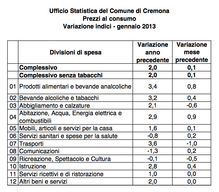 Inflazione, a gennaio i prezzi al consumo sono cresciuti dello 0,1% rispetto al mese scorso. La variazione arriva invece a +2% rispetto a gennaio 2012. Questi i dati appena pubblicati dall’ufficio statistica del Comune di Cremona. Passando all’analisi dei diversi settori, la crescita più rilevante su base annua è quella dei prodotti alimentari: +3,4% (+0,8% sul mese precedente). Bevande alcoliche e tabacchi: +3,2% rispetto all’anno prima (+0,4% dopo dicembre). Abitazione, acqua, energia e combustivili in aumento del 2,9% da gennaio 2012 e dello 0,9% rispetto agli ultimi calcoli.