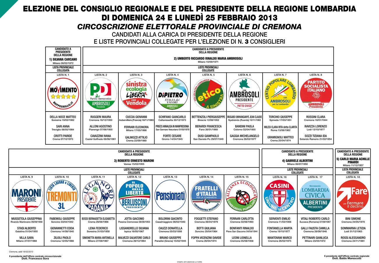 Cinque candidati per la presidenza della Regione Lombardia. Diciotto liste nella provincia di Cremona per l’elezione di tre consiglieri. Il Movimento 5 Stelle schiera a sostegno di Silvana Carcano due uomini e una donna, da Soresina e da Crema. Sette le liste cremonesi a sostegno del candidato del centrosinistra Ambrosoli con nove donne e dodici uomini (solo Pd e Partito Socialista privilegiano le quote rosa). Ci sono anche Sel, Idv, Etico a Sinistra, Lista Civica Ambrosoli, Centro Popolare Lombardo. Sette le liste a sostegno di Roberto Maroni con dieci donne e undici uomini. Le liste sono Maroni Presidente, Tremonti, Lega Nord, Pdl, Pensionati, Fratelli d’Italia, Allenaza Ecologica. Due liste a favore di Gabriele Albertini (Udc e Lombardia Civia) con due donne e quattro uomini candidati. Fare e Fermare il Declino sostiene l’aspirante governatore Carlo Maria Pinardi con due cremonesi e una donna originaria di Lodi.