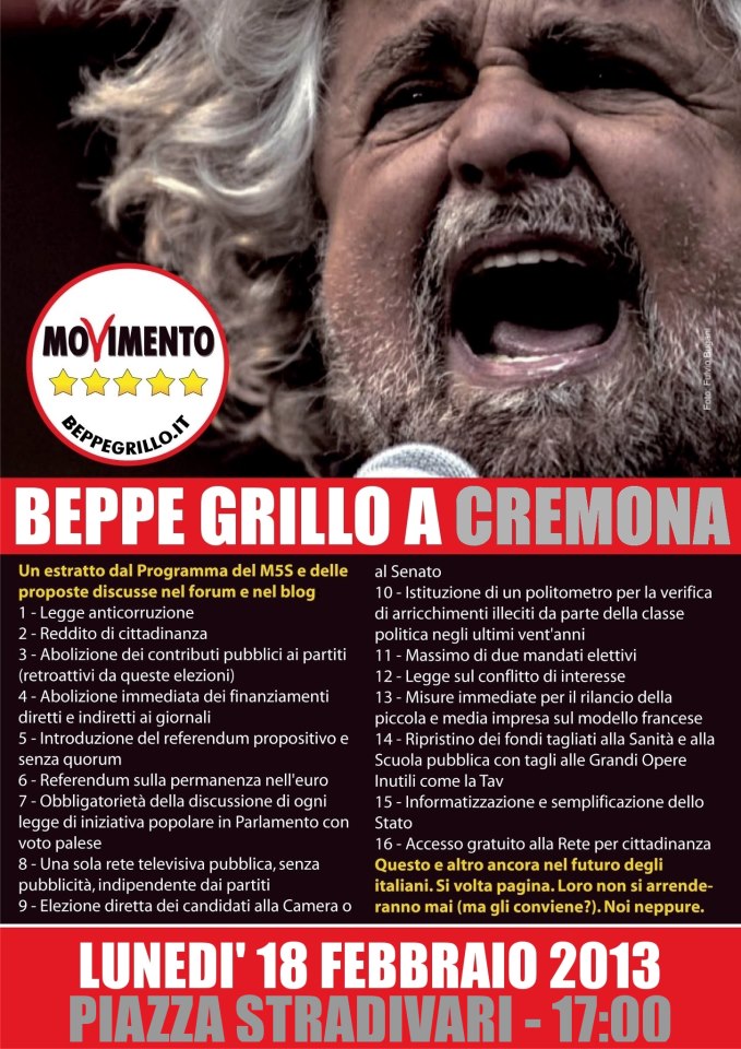 Beppe Grillo lunedì in città. Ora c’è il programma della tappa cremonese della sua campagna elettorale. Come noto, il comico genovese sarà in piazza Stradivari a partire dalle 17. Con lui ci sarà anche Silvana Carcano, candidata del Movimento 5 Stelle al ruolo di presidente della Regione Lombardia. A presentare l’evento sarà Alessandro Tegagni, esponente di Cremona dei 5 Stelle. La parola passerà poi ai singoli candidati del territorio per le regionali e per il Parlamento.