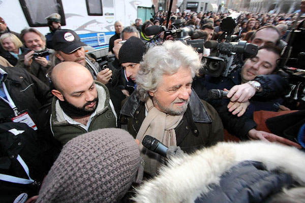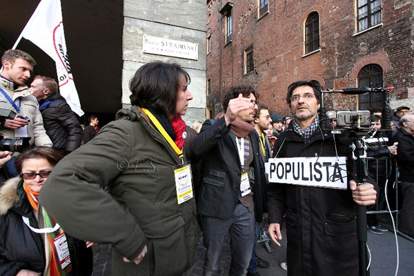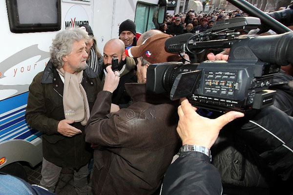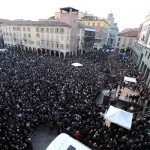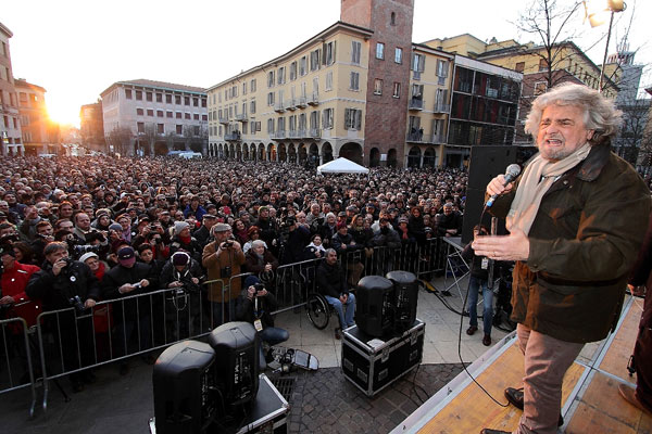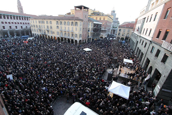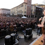 Grillo riempie piazza Stradivari. Arriva poco dopo le 17 a bordo del suo camper preso in prestito, come dice lui. La gente è accalcata davanti al palcoscenico, ma anche ai lati e sotto i portici della Camera di Commercio. “Siamo un virus”, esordisce il comico genovese, leader del Movimento 5 Stelle davanti alla folla (tantissimi giovani). “Non è che deve succedere qualcosa – grida Grillo – E’ già successo. Questo non è un comizio, è un incontro. Noi siamo una comunità, come dovrebbe essere l’Italia”. Sfila il microfono dall’asta e continua: “Io ho sempre fatto così – dice – Non faccio politica, è vent’anni che dico queste cose. E loro parlano solo del fatto che io vada o non vada in televisione. Ecco, le piazze sono la dimostrazione che la televisione non ci serve. Noi siamo la televisione”. Ce l’ha con i giornalisti (“Adesso ci riprendono dal basso all’alto e poi inquadrano le piazze quando siete andati via”), con i sindacati (“Insieme ai partiti sono responsabili del degrado del paese”), con i leader politici. Spazia dallo scandalo Monte dei Paschi agli stipendi di manager e politici, al welfare (“Voglio uno stato che vi protegga e che non vi schiacci. Siamo noi che vogliamo sapere come i politici spendono i nostri soldi, non il contrario”). Tra i punti toccati anche le dimissione del papa (“Le pecorelle vogliono parlare con il pastore. Adesso succederà qualcosa: vogliamo un papa nero!”), le grandi opere (“Non servono, il futuro è leggero”), le eccellenze (“Stanno morendo. La colonna vertebrale dell’Italia sono le piccole medie imprese che chiudono, bisogna rimetterle al centro della nostra economia”), la giustizia (“In questo paese se hai i soldi in galera non ci vai”), la rete internet (“Quella sì che unisce”). “Siamo i migliori del mondo, siamo ancora in tempo ad essere i migliori del mondo – conclude Grillo – Alle urne dobbiamo dare un segnale al paese perché loro devono andare tutti a casa. Nè di destra né di sinistra, queste sono solo idee buone”.