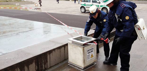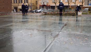 che ha soccorso l’uomo e l’ha trasportato in ospedale in codice giallo. I vigili hanno provveduto a delimitare di nuovo la zona (alla quale non era già consentito accedervi). ‘Vietato salire. Pavimento scivoloso. Pericolo di caduta, si legge sui cestini a lato del quadrato interessato.