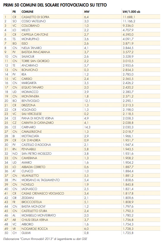 Provincia cremonese ai vertici per impianti fotovoltaici su tetti e coperture nell’ultimo rapporto stilato da Legambiente. Ben sei realtà del nostro territorio presenti nella top-50 elaborata dall’associazione. Questo il risultato del dossier Comuni Rinnovabili 2013. In Italia oltre 600mila gli impianti da fonti rinnovabili. Di grande e piccola taglia, termici ed elettrici, sono ormai diffusi nel 98% dei Comuni italiani, dalle aree interne ai grandi centri. Il rapporto valuta diverse categorie. Ci sono ad esempio i Comuni 100% rinnovabili (dove un mix di impianti diversi allacciati a reti di teleriscaldamento coprono interamente e superano i fabbisogni elettrici e termici dei cittadini residenti), quelli dell’eolico, quelli della geotermia, del mini idroelettrico. Ognuno di questi capitoli ha una propria graduatoria. L’area della provincia cremonese è presente fra i Comuni del solare. In Italia sono 7.937, un numero in crescita. Spetta a Casaletto di Sopra (Cremona) e a Don (Trento) il record di impianti per abitante, rispettivamente per il fotovoltaico e per il solare termico. Il Comune con la più ampia diffusione di impianti fotovoltaici su tetti degli edifici è, come detto, Casaletto di Sopra, con 548 abitanti, 11.600 kW ogni 1.000 abitanti e 6,4 MW complessivi di impianti solari. Basta scendere di poche posizioni per trovare un altro Comune della provincia: quinto, Cappella Cantone, con 2,7 MW e 4.590,0 kW ogni 1.000 abitanti. Drizzona e Volonto al 21esimo e al 22esimo posto, Ca’ D’Andrea al 29esimo e Casale Cremasco Vidolasco al 41esimo.