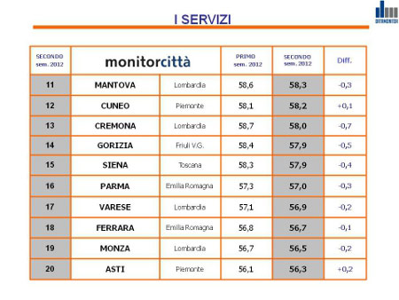 Oltre all’apprezzamento dei sindaci, Datamonitor fotografa la soddisfazione espressa dai cittadini sulla qualità dei servizi erogati. Sul podio si conferma il duo Bolzano-Trento, rispettivamente con il 76,9% e il 69,9%. Al terzo posto Reggio Emilia che con il 66,1%. Cremona il 13esimo posto del marzo 2012 con una percentuale del 58%, in calo di 0,7 punti percentuali rispetto al primo semestre 2012.