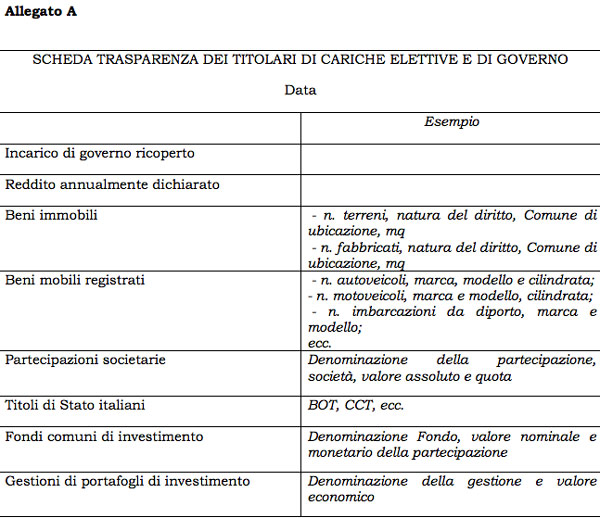 Lo schema della ‘scheda trasparenza’ in fase di studio in Comune