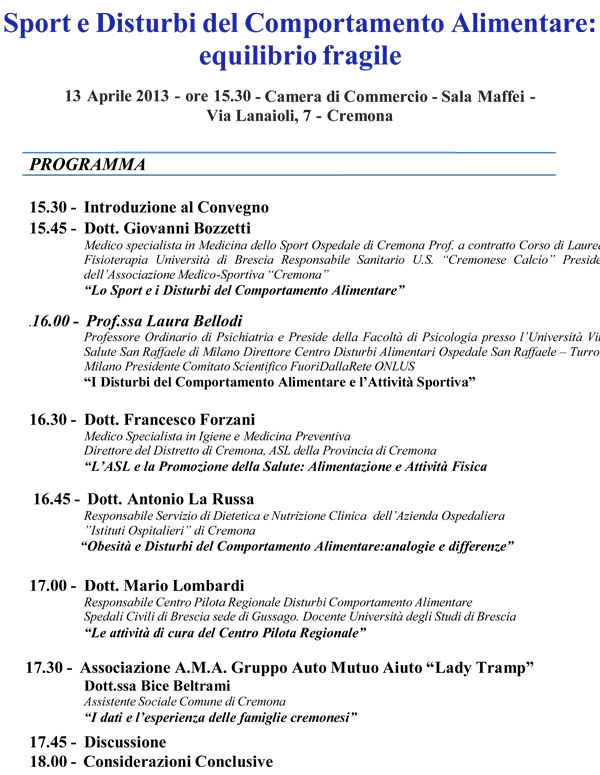 Sabato 13 aprile alle 15,30, presso la Sala Maffei della Camera di Commercio di via Lanaioli 7 a Cremona, si terrà il convegno Interclub “Sport e disturbi del comportamento alimentare: equilibrio fragile”. Il programma dell’incontro prevede la partecipazione dei massimi esperti in materia.
