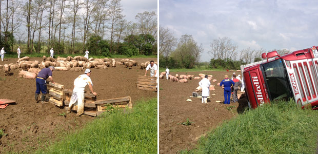 Camion di maiali si ribalta in via Bergamo Pompieri sul posto