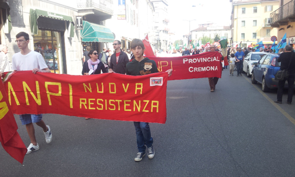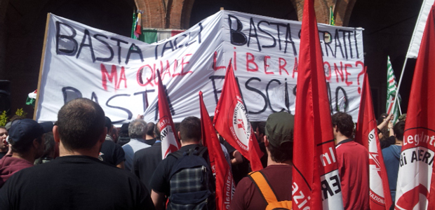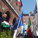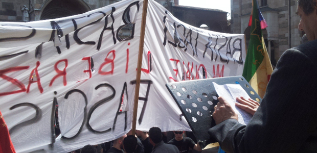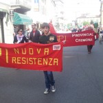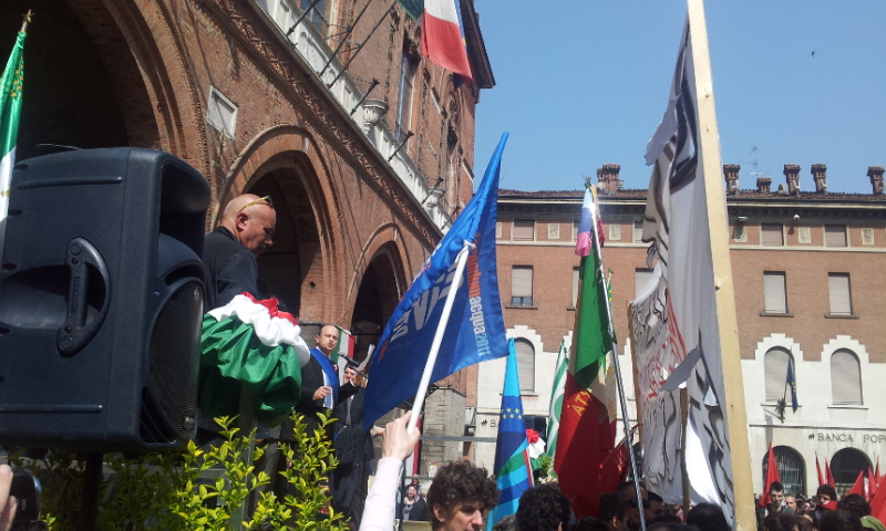 Contestazione dei centri sociali quando le autorità hanno preso la parola in piazza Duomo per la celebrazione del 25 aprile. Circa 50 persone si sono infilate in un “corridoio” lasciato libero davanti al palco e hanno oscurato la visuale dell’intera impalcatura, coperta con uno striscione (vedi foto): “Basta tagli, basta sfratti. Ma quale Liberazione? Basta fascismo”. All’origine della protesta anche la concessa apertura della sede di CasaPound in città. Cori durissimi e fischi hanno ostacolato i discorsi del sindaco di Cremona Oreste Perri e di Antonio Agazzi, capogruppo del Pdl arrivato in rappresentanza della Provincia. E’ nata poi una discussione fra le associazioni di partigiani e i contestatori. La calma è tornata (e lo striscione è stato rimosso) quando ha cominciato a parlare Giovanni Scotti della Divisione Acqui Cremona.