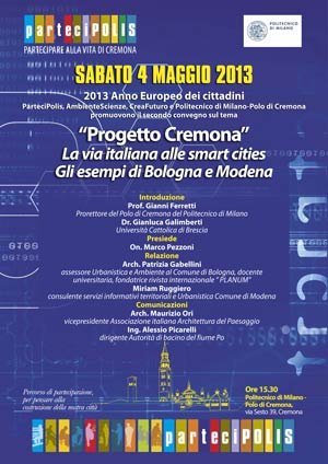 Sabato prossimo 4 maggio (ore 15.30) al Politecnico di Cremona, seconda giornata che il circolo culturale Ambientescienze dedica al tema delle smart cities, denominazione che sta ad indicare un insieme di buone pratiche, nell’organizzazione urbana, che vanno dall’utilizzo delle tecnologie digitali su vasta scala al contenimento dei consumi. Partner dell’iniziativa i gruppi Partecipolis, CreaFuturo e il Politecnico di Milano sede di Cremona. Tra gli interventi sono previsti quelli introduttivi di Gianni Ferretti, Prorettore del Polo di Cremona del Politecnico di Milano e Gianluca Galimberti, dell’Università Cattolica di Brescia. Presiede Marco Pezzoni. Le relazioni di questa seconda giornata, dopo quella di febbraio nella