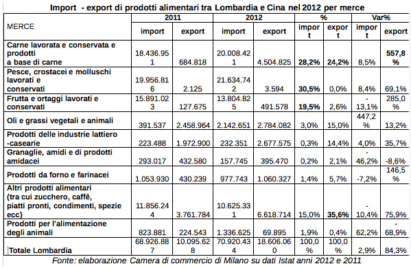 Nel 2012 la Lombardia ha esportato in Cina prodotti alimentari per oltre 18 milioni di euro registrando una crescita dell’84,3% e ha importato per circa 71 milioni (+2,9%). L’export si concentra a Milano (36,3%) e Cremona (19,2%), l’import a Milano (47,9%) e Como (16,3%). Nell’export regionale pesano, dopo i prodotti alimentari come caffè, zucchero, condimenti e pasti pronti (35,6%), la carne lavorata e conservata ed i prodotti a base di carne (24,2%), nell’import il pesce (30,5%), i prodotti a base di carne (28,2%) e la frutta ed ortaggi lavorati e conservati (19,5%). E’ quanto emerge da un’elaborazione su dati Istat. L’esportazione dei prodotti lombardi legati alla carne è quello che cresce di più: +558% tra 2011 e 2012. Osservando più nel dettaglio il panorama cremonese, l’export fra 2011 e 2012 è cresciuto del 131,6%.