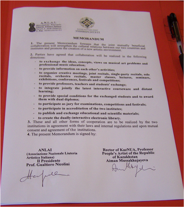 La liuteria cremonese arriva fino in Kazakistan. Una delegazione governativa kazaka ha incontrato nel primo pomeriggio di sabato il presidente dell’Anlai (Associazione Nazionale Liuteria Artistica), Gualtiero Nicolini, impegnato al salone di San Pietro al Po per la consegna degli strumenti musicali che partecipano al concorso di liuteria di Pisogne. Il risultato dell’incontro è un documento condiviso per una collaborazione in campo liutario. Tra gli obiettivi, anche lo studio per l’apertura di una scuola per la costruzione di violini in Kazakistan. Fra i punti del documento, incontri e iniziative in collaborazione fra le due realtà e scambi formativi tra giovani liutai.