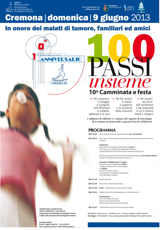 Appuntamento domenica 9 giugno per la X edizione di “100 passi insieme – Camminata e festa di solidarietà in onore dei malati di tumore, dei loro famigliari e amici”, iniziativa che – fra le varie attività organizzate da Medea – rappresenta quella che esprime la maggiore vicinanza ai malati e alle famiglie. La Camminata si propone di rendere onore all’impegno e al coraggio dei malati e delle persone che stanno loro vicine nella lotta contro il cancro, sostenendo la forza dei malati e delle loro famiglie, la loro dignità nell’affrontare la malattia e le cure necessarie, facendo sentire il supporto e la vicinanza della comunità in cui vivono e aiutandoli ad uscire dall’isolamento in cui il tumore tende a relegarli.