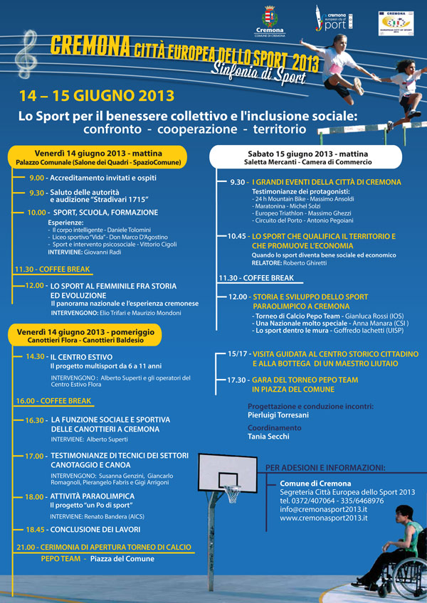Sabato 15 giugno i lavori si terranno nella Saletta Mercanti della Camera di Commercio dove, alle 9,30, porteranno la loro testimonianza i protagonisti dei grandi eventi sportivi di Cremona Città Europea dello Sport: Massimo Ansoldi per la 24 h di Mountain Bike, Michel Solzi per la Maratonina, Massimo Ghezzi per la Triathlon Sprint European Cup, ed Antonio Pegoiani per il Circuito del Porto. Sarà poi la volta di Roberto Ghiretti che tratterà lo sport come bene sociale ed economico. I lavori si concluderanno con una panoramica sulal storia e lo sviluppo dello sport per disabili a Cremona a cura di Gianluca Rossi, Anna Manara del CSI e Goffredo Iachetti dell’UISP.