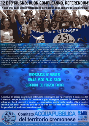 I referendum per l’acqua pubblica compiono due anni e i comitati scendono in piazza. Anche a Cremona dove gli aderenti hanno organizzato una serata il 12 giugno ai giardini di piazza Roma. “Il 12 e il 13 di giugno di due anni fa – scrive Giancarlo Carotti del Comitato – il percorso verso la ripubblicizzazione del servizio idrico del Forum Italiano dei Movimenti per l’Acqua raggiunse lo straordinario risultato della vittoria