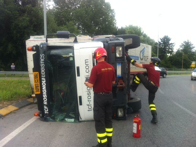 AGGIORNAMENTO – Camion ribaltato sulla Castelleonese. L’incidente è avvenuto a Cremona, poco dopo le 18,30, alla rotonda fra l’Ipercoop e lo svincolo per il quartiere Cambonino. Coinvolto un mezzo della Rosignoli Logistics carico di coils in acciaio. Sul posto soccorso medico, vigili del fuoco per estrarre il ferito e per rimuovere il camion, e polizia stradale per ricostruire nel dettaglio la dinamica del sinistro e per regolare il traffico. Il veicolo pesante si è ribaltato autonomamente (nessun altro è rimasto coinvolto) . L’autista, un uomo di 46 anni, ha riportato ferite di media gravità e, fortunatamente, non risulta in pericolo di vita.