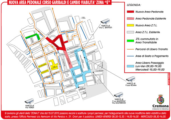 Una data certa non c’è ancora. Ci sono stati ritardi nella consegna al Comune degli arredi urbani. Intanto, sulla pedonalizzazione di corso Garibaldi, la Giunta si sta muovendo, facendo arrivare nelle cassette dei residenti un volantino informativo riguardante con mappa delle zone interessate: non solo il corso, anche via Palestro, via Goito, via Milazzo e via Cazzaniga. Con tale informativa si avvisano i cittadini che, a partire dal 15 luglio prossimo, possono recarsi all’Ufficio Permessi di AemCom di via Persico n.31 per sostituire i propri permessi per l’adeguamento alle nuove modifiche della viabilità e della sosta. Nulla sul via all’operazione. Il 12 luglio dovrebbero arrivare gli arredi urbani, richiesti dalle categorie di commercianti. Ma per la data ufficiale della pedonalizzazione occorre aspettare.