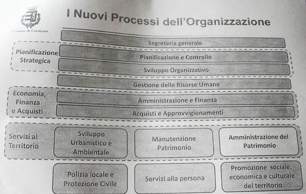 In precedenza Placchi aveva sintetizzato le previsioni dello studio. Tre gli input che ne derivano: necessità di razionalizzare alcuni settori contigui in cui è indispensabile un’integrazione; recuperare produttività (tempi lunghi per svolgere determinati funzioni anche a causa della dislocazione logistica degli uffici); forte necessità di investimenti tecnologici. La riorganizzazione dell’ente prevede la creazione di sette centri di responsabilità per altrettanti dirigenti (attualmente ne sono attivi 15), oltre al Segretario generale (vedi schema). I “Servizi al territorio”, con all’interno “Sviluppo urbanistico”, “Manutenzioni, Patrimonio”, e “Amministrazione del patrimonio” rappresenterebbe una vera rivoluzione dell’esistente in quanto concentra sotto un unico dirigente quattro attuali (Masserdotti, Pagliarini, Ghilardi, Carletti). E’ stato anche il settore su cui Placchi si è soffermato di più: “Un accorpamento di questo genere lo avevamo già prospettato nel 2010 alla Giunta Segalini ed io”, ha spiegato il direttore generale. “Si tratta di un’area in cui è necessaria una stretta integrazione, io stesso me ne sono reso conto quando ho svolto le funzioni a scavalco. Ed è in un’area come questa che il dirigente deve essere un esperto in materia gestionale. Non necessariamente uno specialista, ma un manager che sappia raccordare le esigenze dell’ente alla disponibilità delle risorse”. Ma l’esempio del Territorio vale per tutti gli altri dirigenti – manager delineati dallo studio. Anche per i tre centri di responsabilità a sé stanti: “Polizia Locale e protezione civile”, “Servizi alla Persona”, “Promozione sociale, economica e culturale del territorio”. Come si nota, sparisce la dirigenza unica del Settore Cultura, quella del Marketing territoriale e delle Politiche Educative.