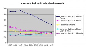 Altalenante l’andamento delle iscrizioni negli ultimi 8 anni. Drastico è il calo delle iscrizioni alla sede cremasca dell’università di Milano, passata da 1099 del 2006 a 637 del 2013, tutte le altre sedi mantengono sostanzialmente gli stessi numeri, pur con alcune differenze di anno in anno. In crescita ultimamente si mostrano Politecnico e Cattolica del sacro Cuore, mentre Musicologia e Lettere sono stabili e nessuna variazione è possibile per i corsi in professioni sanitarie dell’università di Brescia essendo a numero chiuso (ma le richieste di iscrizione continuano ad aumentare).