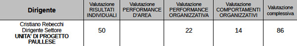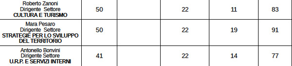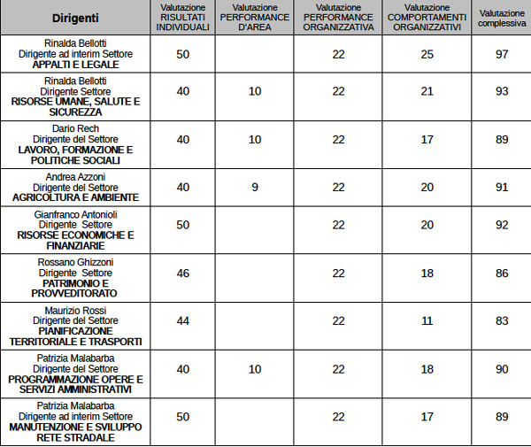 Le valutazioni si sono basate sulla proposta del Nucleo Indipendente di Valutazione che prevede diversi punteggi a seconda di 4 diversi aspetti dell’attività dirigenziale: risultati individuali, performance d’area, performance organizzativa, comportamenti organizzativi. La somma di questi valori dà il risultato della valutazione complessiva. Questa la tabella finale: