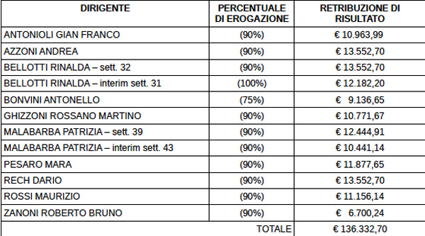 Ammonta a 136.332 euro la somma delle “retribuzioni di risultato” che la Provincia distribuirà tra i suoi 10 dirigenti. Una cifra complessiva che è inferiore al fondo che era stato accantonato, – superava i 152mila euro – da ripartire nel caso tutti avessero ottenuto il massimo punteggio possibile. Così non è stato, i punteggi sono stati quasi tutti al 90%, tranne un caso al 75% (Antonello Bonvini) e un unico 100% (Rinalda Belotti per l’incarico svolto ad interim al settore 31). Incluso nell’elenco, anche se il compenso viene attinto da un diverso fondo, Cristiano Rebecchi, direttore dell’Unità di progetto Paullese, a cui vanno 990,46 euro.