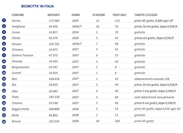 Uno specchietto di alcune città in cui è attivo Bicincittà con tariffe