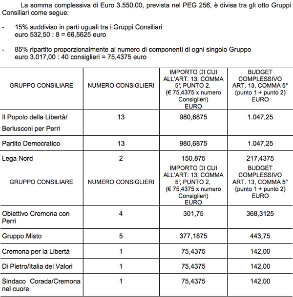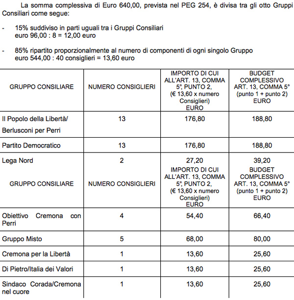 Altri 4mila euro ai gruppi consiliari del Comune. Pubblicate sull’albo pretorio le determine dirigenziali circa la seconda tranche del pagamento per acquisto di beni e prestazioni di servizi dal 31 maggio fino al 30 settembre 2013 (quattro mesi). Fanno parte della cifra complessiva stanziata per 12 mesi: 14 mila e 700 euro (12.500 per i beni, 2.200 per i servizi). E’ il budget finanziario che viene determinato all’inizio di ogni anno e che non viene modificato anche se sopravvengono cambiamenti nel numero e nella composizione dei gruppi. Ora, con il primo pagamento fino al 31 maggio (900 euro per servizi, 5.200 per beni) e questa seconda tranche, ai gruppi è stato approvato il 70% del contributo. Il 15% viene suddiviso in parti uguali tra i consiglieri, mentre l’85% ripartito proporzionalmente al numero di componenti di ogni singolo gruppo. L’ultimo pagamento (relativo ai mesi da giugno a settembre compresi) vede impegnati 3550 euro per l’acquisto di beni (1.047 euro a Pdl e Pd, 443 euro a Gruppo Misto, 368 euro a Obiettivo Cremona con Perri) e 640 euro per i servizi (188 euro a Pdl e Pd, 80 euro a Gruppo Misto, 66 euro a Obiettivo Cremona con Perri).