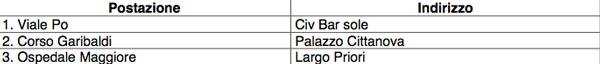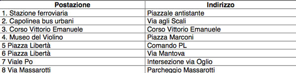 Nelle otto postazioni previste mancano corso Garibaldi (di recente pedonalizzato per un tratto) e l’ospedale, che potranno essere aggiunte (insieme ad un secondo punto in viale Po) nel caso di ampliamento del servizio con risorse per l’istallazione e il mantenimento al di fuori della gara in questione.