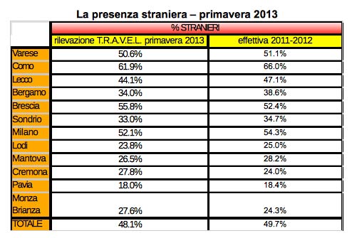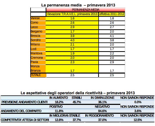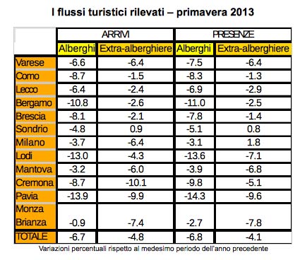 “Rispetto allo stesso periodo del 2012 – si legge nella sintesi della rilevazione, effettuata presso un “campione selezionato e significativo di strutture ricettive” – gli arrivi turistici in Lombardia sono calati del 6.7% per gli alberghi/hotel e del 4.8% per le strutture extra-alberghiere (residence, bed & breakfast e campeggi). I dati sono in linea con l’andamento rilevato per le presenze (che considerano il numero dei pernottamenti, ndr) negli alberghi (-6,8%), che in Lombardia assorbono l’80% dei flussi turistici. Sembra confermarsi una forte problematicità per il settore: la breve durata delle permanenze medie per i turisti in Lombardia. Indicazioni provenienti da Regione Lombardia sembrano confermare che sia in atto un trend decrescente, anche più negativo di quello emerso in questa indagine”. In Italia “gli arrivi complessivi di turisti sono diminuiti del 5.4%, mentre pari al 6.4% è stata la riduzione delle presenze sul territorio nazionale”.