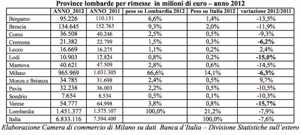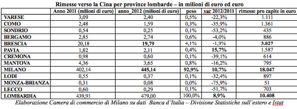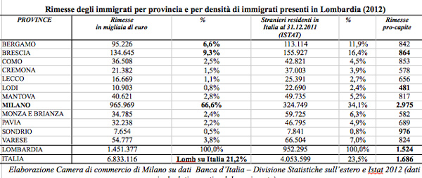 In media gli immigrati lombardi hanno mandato a casa 1.524 euro a testa con punte per la provincia di Milano (2.975 euro) e gli immigrati cinesi (10.408 euro in media considerando solo i cinesi residenti in regione).