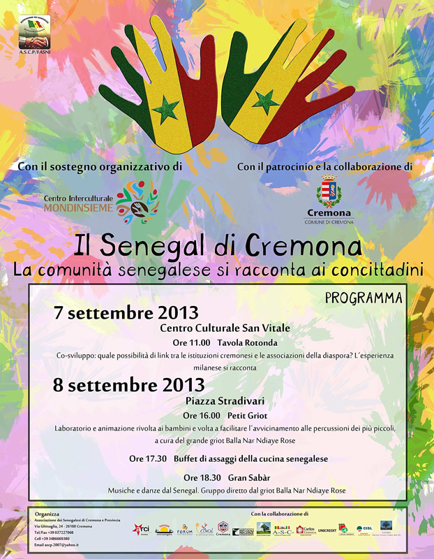 L’Associazione dei Senegalesi di Cremona e Provincia organizza, con il sostegno del Centro Interculturale Mondinsieme e il patrocinio e la collaborazione del Comune di Cremona, una due giorni dedicata alla cultura senegalese.