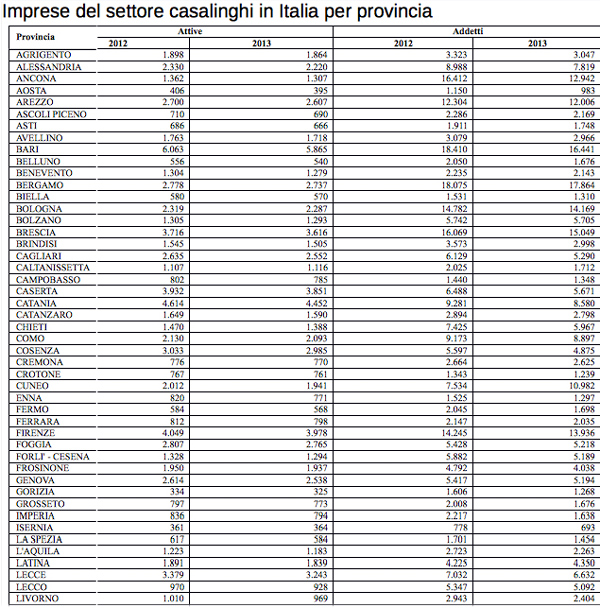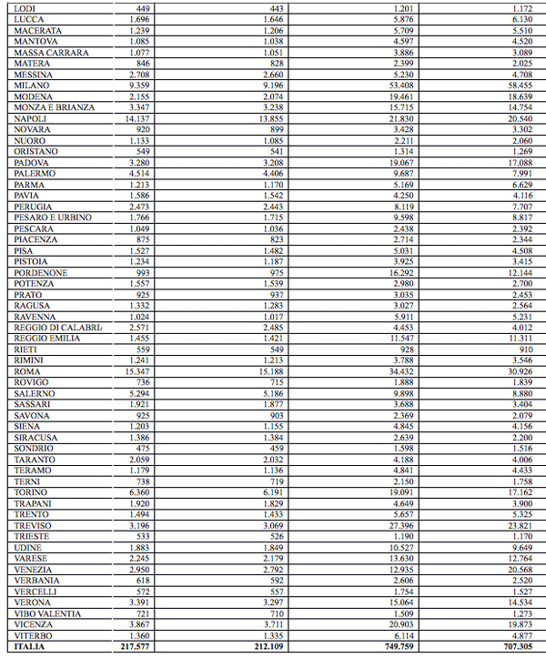 Le prime province in Italia per attività sono: Roma con 15mila imprese e 31mila addetti, Napoli (14mila, 20mila), Milano (9mila, ma prima per i 58mila addetti), Torino (6mila, 17mila). Tra le prime anche Bari, Salerno, Catania, Palermo, Firenze.