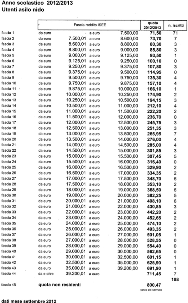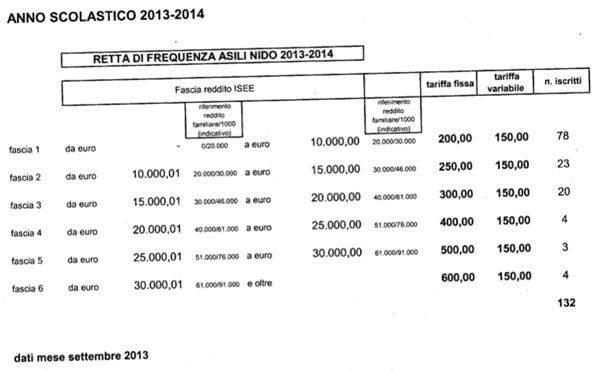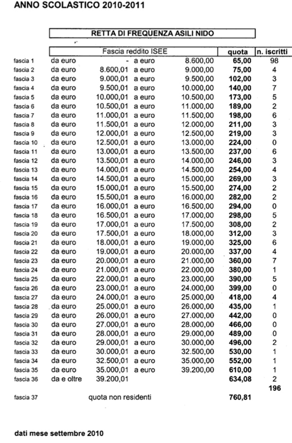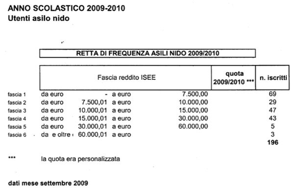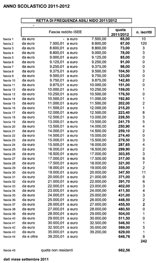 Superavano ancora le 200 unità le iscrizioni per l’anno 2011-2012. 242 con 10 iscritti in fascia minima (fino a 7mila 500 con quota di 65 euro) e 120 in fascia 2 (fino a 8mila 600 euro con tariffa di 67 euro al mese). 196 le iscrizioni nel 2010-2011 con 98 nuclei in fascia 1 (fino a 8mila 600 euro per una quota di 65 euro). 196 anche nel 2009-2010 con una più ampia distribuzione nelle fasce di reddito: 69 in fascia 1 (fino a 7mila 500 euro), 29 in fascia 2 (fino a 10mila euro), 47 in fascia 3 (fino a 15mila) e 43 in fascia 4 (fino a 30mila).