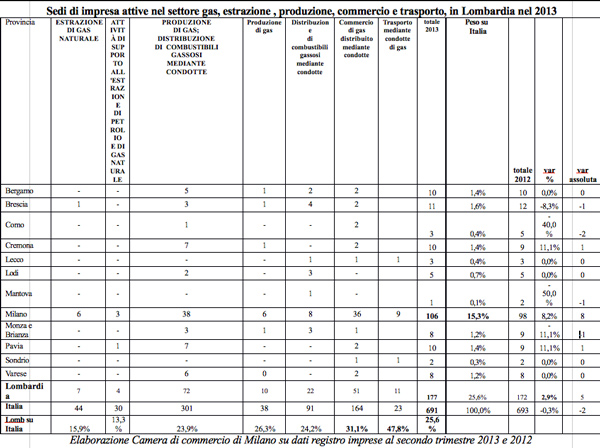 Le imprese del settore gas. Sono 177 le imprese attive in Lombardia nel comparto gas tra estrazione, produzione, distribuzione, commercio e trasporto, il 25,6% del totale italiano del settore (691 imprese), +2,9% in un anno. La Lombardia pesa in Italia soprattutto nei settori del commercio di gas distribuito mediante condotte e del trasporto concentrando rispettivamente il 31,1% e il 47,8% delle imprese nazionali. Milano è prima con 106 imprese attive, il 59,9% lombardo e il 15,3% italiano, in crescita dell’8,2% in un anno. Cremona è terza in regione (dopo Brescia), alla pari di Bergamo e Pavia con dieci imprese attive nel 2013 nel settore del gas. Sette sono le ditte che si occupano di produzione di gas e distribuzione di combustibili gassosi mediante condotte, una impresa è segnalata per produzione di gas, due quelle per commercio di gas. Il peso di Cremona sul totale italiano è dell’1,4%. La variazione dal 2012 al 2013 è in crescita dell’11,1%. Alle ultime posizioni della classifica ci sono Mantova (una sola impresa), Sondrio (due imprese), Como e Lecco (tre imprese).