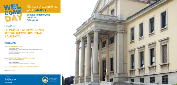 Venerdì 4 ottobre, alle ore 10.30, si terrà presso l’Aula Magna dell’Università Cattolica di Cremona il Welcome Day, un incontro dedicato alle matricole delle Facoltà di Economia e Giurisprudenza e di Scienze agrarie, alimentari e ambientali. Sono previsti i saluti del dott. Mauro Balordi, Direttore della Sede di Piacenza-Cremona, della dott.ssa Jane Alquati, Assessore alle Politiche educative con delega all’Università del Comune di Cremona, e della prof.ssa Paola Orini, Assessore all’Istruzione, Formazione e Lavoro della Provincia di Cremona. Interverranno la prof.ssa Annamaria Fellegara, Preside della Facoltà di Economia e Giurisprudenza, e il prof. Lorenzo Morelli, Preside della Facoltà di Scienze agrarie, alimentari e ambientali. Saranno poi presentati il centro pastorale e i servizi attivati presso la sede: tutorato, orientamento, stage e placement, Ufficio Internazionale, corsi del Centro per l’innovazione e lo sviluppo delle attività didattiche e tecnologiche di Ateneo (ILAB) e del Servizio Linguistico d’Ateneo (SeLdA), biblioteca. L’incontro intende fornire alle matricole le informazioni essenziali per orientarsi all’interno della sede, facilitare l’assunzione di un buon metodo di studio e avviare così nel migliore dei modi la carriera universitaria.