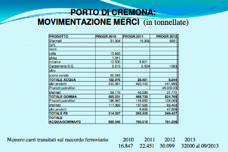 Oltre alle presenze storiche nel porto cremonese, come Abibes (oggi in difficoltà, dopo l’addio di Tamoil alla raffinazione), Arvedi, Airoldi, Trasporti Pesanti, Veronesi, Consorzio Agrario, Fagioli, Lameri, si sono aggiunti in anni più recenti i gruppi logistici Katoen Natie (55mila kmq di piattaforma logistica e magazzini per 28.mila kmq) e Gruppo Bernardini. Altri sarebbero pronti ad insediarsi. L’andamento delle movimentazioni merci negli ultimi tre anni sembra dar ragione a chi sta investendo nel sito: dai 16 mila carri transitati sul raccordo ferroviario nel 2010 si è passati ai 32mila del 2013 (dato di settembre). Il grosso della movimentazione merci avviene su gomma: 594mila tonnellate nel 2012; seguito dal ferro (248mila) e dall’acqua (8000 tonnellate). A pesare in negativo su quest’ultima voce di trasporto nel 2012 è stata la drastica diminuzione degli sfarinati (7mila tonnellate nel 2012 contro le 50mila del 2010, vedi tabella).