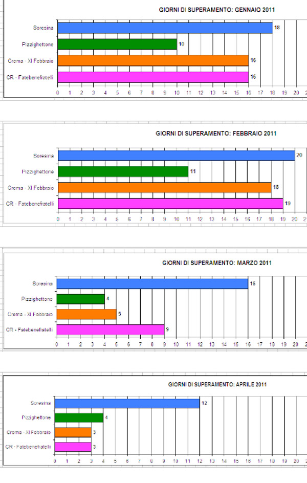 La notizia di Cremona nella lista nera per inquinamento atmosferico a livello europeo (fonte Agenzia europea per l’Ambiente) ha suscitato parecchie reazioni. Anche da parte del Comune che, in risposta ad alcuni commenti pubblicati sotto l’articolo di Cremonaoggi, ha fatto pervenire una nota. “Senza nulla togliere alla serietà del lavoro svolto – si legge nel documento del Comune firmato dall’assessore all’Ambiente Francesco Bordi – forse sarebbe il caso di non considerare i capoluoghi di provincia come realtà a sé stanti, ma quanto agglomerati urbani inseriti in un contesto ben più ampio, quello della Pianura Padana, dove la qualità dell’aria è comunque in generale compromessa. Non si può focalizzare l’attenzione esclusivamente su Cremona città, come si è letto in alcuni commenti ai dati pubblicati, insistendo sugli insediamenti industriali o sulle problematiche della chiusura al traffico del centro storico, perché sarebbe fuorviante rispetto ad una problematica che invece investe tutti i comuni della provincia, dove addirittura per alcuni di questi, e i dati lo dimostrano, la situazione a livello di “sforamenti” annuali è addirittura superiore rispetto al capoluogo”. In allegato alla nota una tabella che mostra i giorni di superamento da gennaio ad aprile 2011 con Soresina che supera la centralina cittadina di via Fatebenefratelli, ad aprile di nove giorni e a marzo di sei.