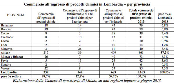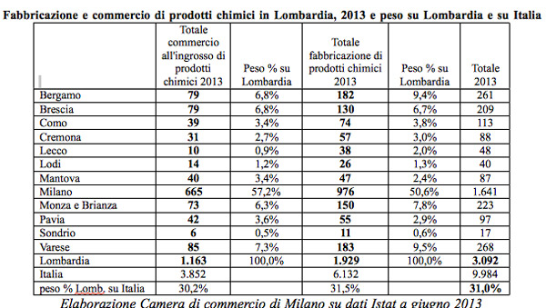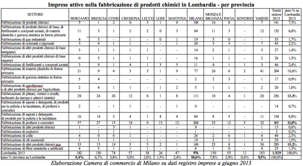 Sono oltre 3 mila le imprese attive in Lombardia nel 2012 nel settore chimico, tra produzione (1.929 le sedi d’impresa) e commercio all’ingrosso (1.163). La regione rappresenta circa un terzo del settore. Quasi il 60% del settore del commercio all’ingrosso si concentra nella provincia di Milano, con 665 imprese, seguono Varese (85 imprese, il 7,3% sul totale lombardo), Bergamo e Brescia in egual misura (79, il 6,8%). Si tratta soprattutto di prodotti chimici per l’industria (59,2% del commercio all’ingrosso lombardo di settore). Anche nella fabbricazione, le imprese attive si concentrano a Milano (50,6%), Varese (9,5%), Bergamo (9,4%). La fabbricazione di profumi e cosmetici rappresenta il 21% del totale lombardo, seguita dalla fabbricazione di altri prodotti chimici (15,2%) e da quella di pitture, smalti e vernici (13,3%). Emerge da un’elaborazione della Camera di commercio di Milano su dati del registro imprese al secondo trimestre 2013 e 2012.