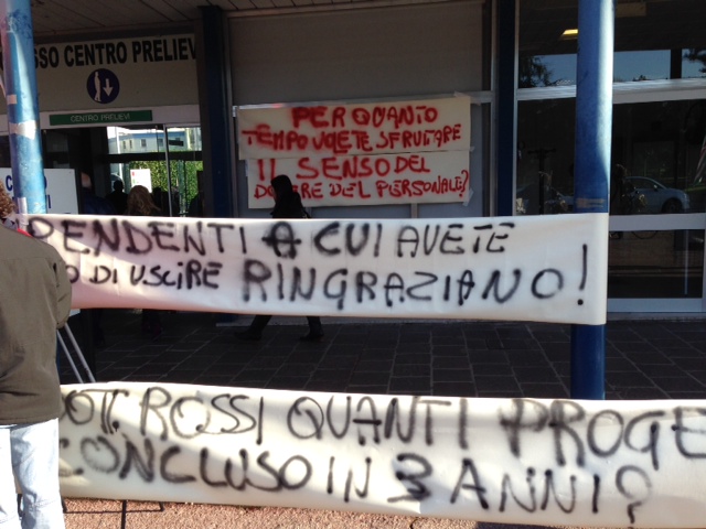 Ma a questo motivo scatenante se ne stanno aggiungendo altri che attaccano, come denuncia un comunicato della Rsu di ieri, le spese sostenute nei tre anni di gestione dell’attuale dirigenza per consulenze, opere edili nella palazzina dirigenziale, utilizzo dell’auto blu, acquisti milionari di macchinari diagnostici mai utilizzati ed altro ancora. Insomma una serie di spese che fanno ritenere ai lavoratori che i soldi in cassa ci siano, ma vengano utilizzati in maniera sbagliata. Gli striscioni appesi all’ingresso prendono di mira tutta la direzione strategica: il direttore sanitario Camillo Rossi (“Quanti progetti hai concluso in tre anni?”) e la direttrice amministrativa Ida Beretta (“Applica la spending review anche agli stipendi dei dirigenti”). Nel corso della mattina i lavoratori in servizio si sono alternati al presidio, compatibilmente con la necessità di non interrompere il servizio in corsia.