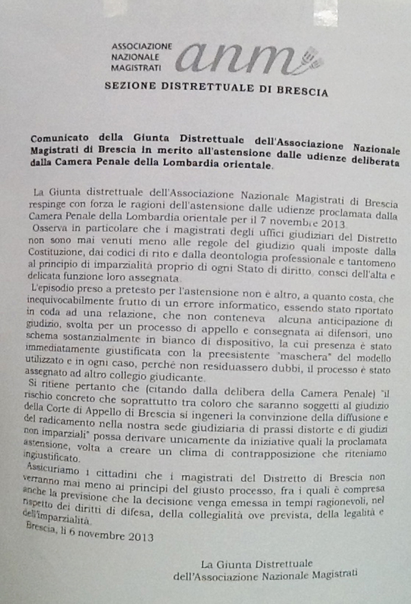“L’episodio preso a pretesto per l’astensione – si legge nel comunicato della Giunta distrettuale dell’associaione nazionale magistrati di Brescia – non è altro, a quanto costa, che inequivocabilmente frutto di un errore informatico, essendo stato riportato in coda ad una relazione che non conteneva alcuna anticipazione di giudizio”. “I magistrati degli uffici giudiziari del Distretto non sono mai venuti meno alle regole del giudizio quali imposte dalla Costituzione, dai codici di rito e dalla deontologia professionale e tantomeno al principio di imparzialità proprio in ogni Stato di diritto, consci dell’alta e delicata funzione loro assegnata”.