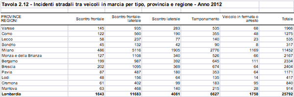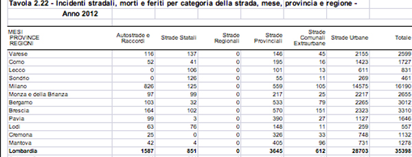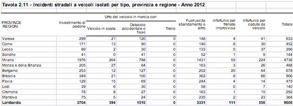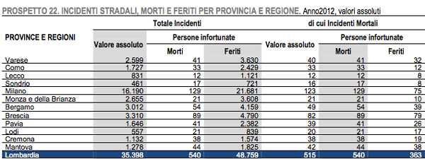 Cresce il numero delle vittime, diminuisce quello degli incidenti sulla strade lombarde. In base ai dati Aci-Istat, nel 2012 si sono registrati in regione 540 vittime di incidenti (rispetto ai 532 dell’anno precedente). Di contro si è registrato un minor numero generale di incidenti (si è scesi da 37.130 a 35.398) e di feriti (da 50.838 a 48.759). Analoga situazione ha interessato la provincia di Milano: aumentate le vittime (da 107 a 129), diminuiti gli incidenti (da 17.065 a 16.190) e i feriti (da 23.036 a 21.681). Fa eccezione la provincia di Monza Brianza che ha registrato una generale diminuzione: nel 2011 vennero contati 2.741 incidenti con 28 morti e 3.631 feriti, nel 2012 vi sono stati invece 2.655 incidenti con 21 morti e 3.608 feriti.