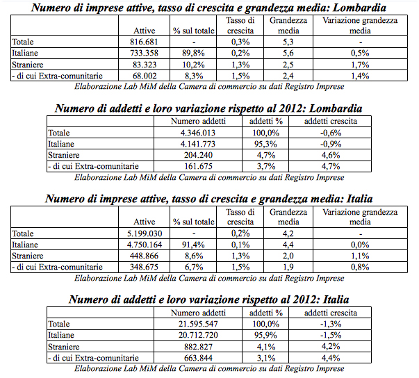 Aumentano, ma diventano anche più grandi: “La grandezza media di una impresa extra-comunitaria è nel 2013 di 2,6 addetti (+0,3% in un anno), rispetto ai 2,4 addetti in Lombardia e a poco meno di 2 addetti in Italia”. Questo si riflette anche nell’occupazione: se al terzo trimestre 2013 l’occupazione a Milano, ad esempio, “è rimasta stabile (+0,1%), lo si deve proprio all’occupazione generata dalle imprese straniere (+6,4% gli occupati, per un totale di oltre 101 mila addetti, pari al 4,7% del totale degli occupati milanesi), una crescita simile registrata dalle solo imprese extra-comunitarie (+6,4%, per un totale di oltre 80 mila addetti, pari al 3,7% del dato milanese). Al contrario le imprese italiane hanno registrato una leggera flessione in termini di occupati (-0,2%)”.