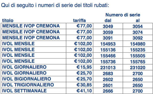 Ritiro dei biglietti, multa e pericolo di incorrere in una denuncia per ricettazione. Questo il chiaro avviso diffuso da Autoguidovie a tutti i viaggiatori che saranno trovati in possesso dei biglietti rubati all’Infopoint della stazione di Crema qualche settimana fa. Ad essere spariti titoli di viaggio della serie ‘Io viaggio ovunque in Lombardia’ e ‘Io viaggio ovunque in Provincia di Cremona’ per un valore ipotetico di oltre 26mila euro. Biglietti, che, nonostante l’arresto, da parte della polizia di stato, di uno degli autori del furto, un marocchino di 22 anni, non sono ancora stati ritrovati. Per questo la società ha dato mandato a tutto il personale addetto al controllo di ritirare i biglietti e multare i possessori di tali titoli di viaggio rubati. Gli utenti che viaggiano con questi biglietti potranno quindi essere denunciati per ricettazione.