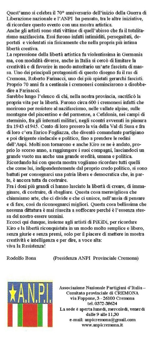 Una mostra per celebrare i 70 anni dall’inizio della Resistenza. La organizza Anpi e Galleria Pikidi arte in via D. Chiesa (dietro palazzo Cittanova). Inaugurazione prevista per sabato 23 novembre alle ore 18 presso la Galleria Pikidi arte. L’esposizione è dedicata a Enrico ‘Kiro’ Fogliazza, partigiano recentemente scomparso. Presenti opere di diversi artisti.