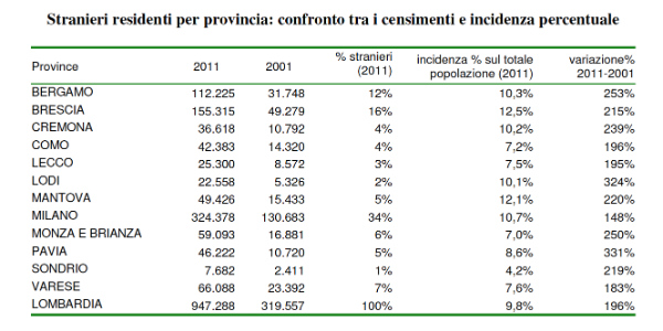 STRANIERI. Nell’ultimo decennio in Lombardia la popolazione straniera è quasi triplicata, passando da 319.557 a 947.288 unità (+196,4%). Lo stesso incremento si registra per l’incidenza percentuale degli stranieri sui residenti, che è passa dal 3,5% del 2001 al 9,8% del 2011. In valore assoluto il numero di cittadini stranieri è cresciuto in tutte le province lombarde, anche se l’incremento maggiore si è avuto a Lodi e a Pavia (+324% e +331%), mentre a Cremona gli stranieri sono aumentati del 239% passando da 10.792 a 36.618. In valore assoluto quindi un incremento di quasi 26mila unità. Nel 2011 la maggior parte dei cittadini stranieri lombardi risiede a Milano, Brescia e Bergamo (34%, 16% e 12% del totale regionale), mentre a Cremona risiede il 4%, come a Como, seguiti da Lecco, Lodi e Sondrio (rispettivamente col 3%, 2% e 1%). L’incidenza percentuale più alta di stranieri sui residenti si registra a Brescia (12,5%) e a Mantova (12,1%), seguono Milano (10,7%), Bergamo (10,3%) e Cremona (10,2%).