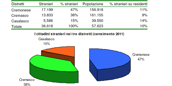 L’aumento maggiore in valore assoluto si è avuto nel capoluogo Cremona con + 5.259 unità, mentre l’incremento percentuale più elevato si è registratoorel comune di Chieve (+1.230%) che è passato da 10 a 133 stranieri, seguito da Ticengo e Ripalta Guerina (+1.100%). Suddividendo i cittadini stranieri per distretto, si nota che quasi la metà dei cittadini stranieri risiede nel distretto cremonese (47%), seguito da quello cremasco (38%) e casalasco (15%). Diversa è l’incidenza percentuale degli stranieri sui residenti: è maggiore nel distretto casalasco (14%), seguita dal distretto cremonese (11%) e cremasco (9%).