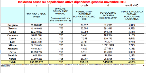 In crescita anche la cassa integrazione: considerando il numero equivalente delle ore in cassa integrazione per occupato, ossia il numero “aggiuntivo” di persone senza lavoro, troviamo: Varese all’8,11%, Lecco al 6,64%, Brescia al 6,52%, Bergamo al 5,81%, Como al 5,55%, Mantova al 3,91%, Pavia a 3,84%, Cremona al 3,15%, Lodi al 2,74%, Milano al 2,71%, Sondrio all’1,11%. La media regionale si colloca a 4,35%.