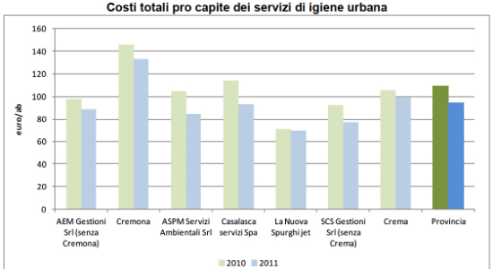 In effetti le aziende, nelle città di maggiori dimensioni, offrono anche altri servizi oltre a quelli di raccolta e smaltimento rifiuti e in particolare lo spazzamento e la pulizia delle strade, che hanno un’elevata incidenza sul costo totale in quanto servizi particolarmente intensi. Per quanto concerne Cremona inoltre l’elevato numero di utenze non domestiche presenti nel Comune e oggetto di specifici servizi di raccolta fa sì che l’indicatore euro/abitante utilizzato appaia in realtà “falsato”.